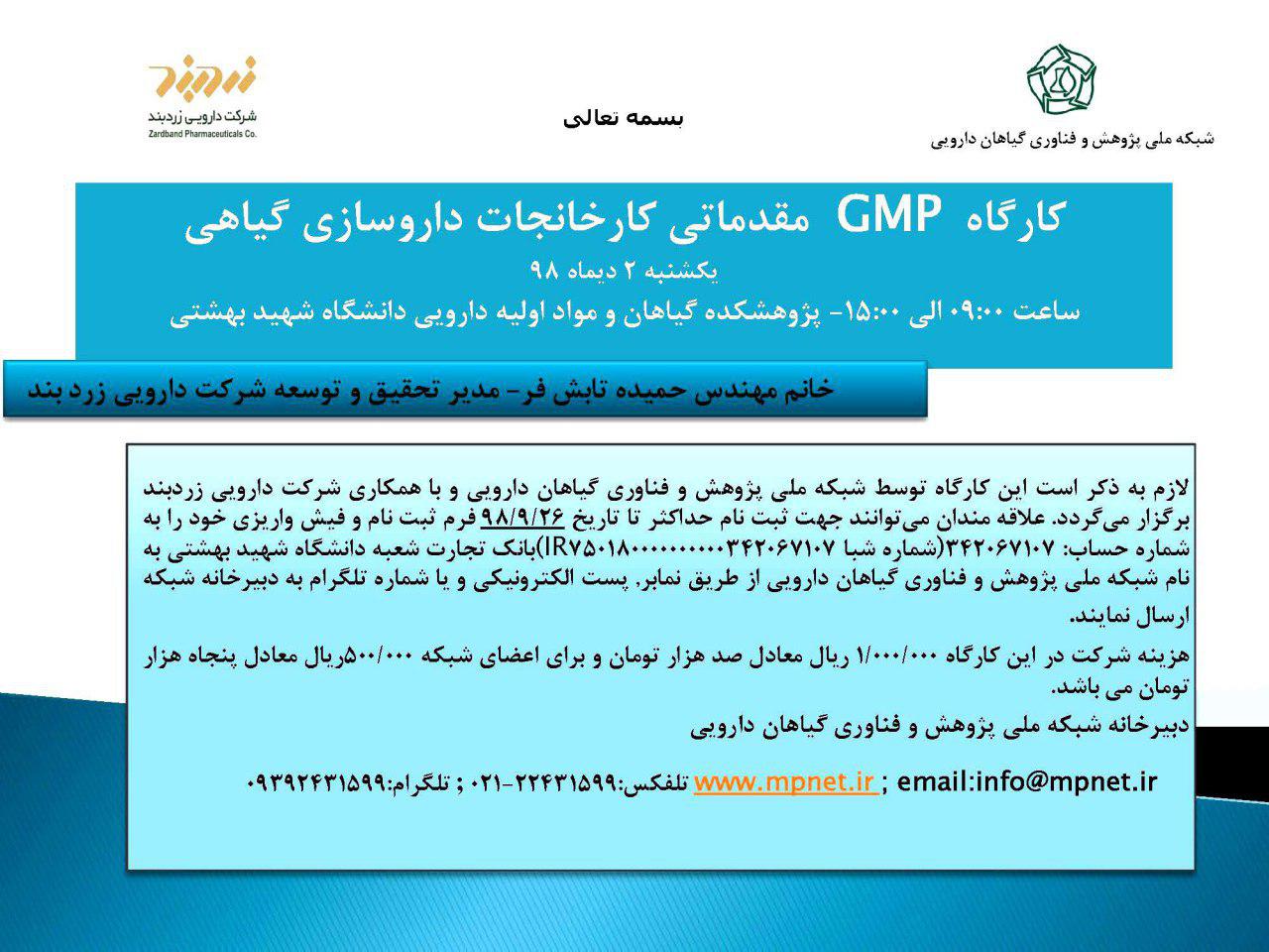 کارگاه آموزشی GMP مقدماتی کارخانجات داروسازی گیاهی توسط شبکه ملی پژوهش و فناوری گیاهان دارویی در تاریخ یکم دیماه ۹۸ برگزار می گردد.